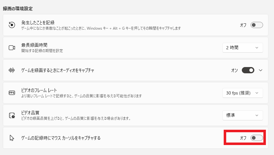 ”ゲームの記録時にマウスカーソルをキャプチャする”をオフにします。