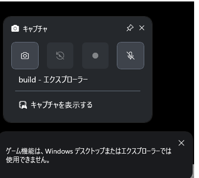 以下のように録画ボタンがアクティブでなく、クリックすると”ゲーム機能は、Windowsデスクトップまたはエクスプローラーでは使用できません。”と表示されることがあります。